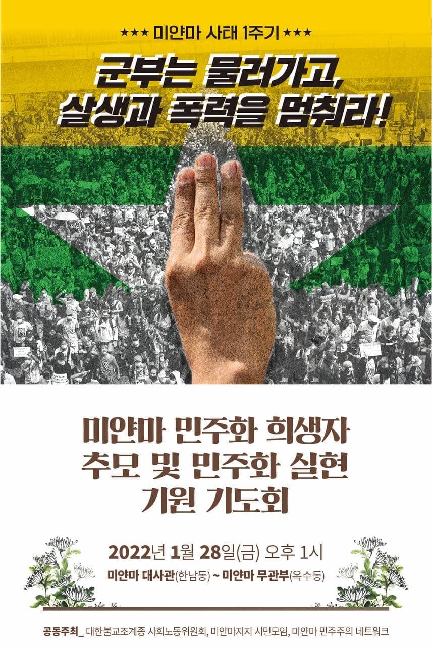 며칠전 미얀마 대사관 앞에서 군부 쿠데타 1년을 규탄하는 미얀마지지시민모임의 기자회견이 있었고, 이어서 조계종 사회노동위원회와 스님들이 미얀마 무관부까지 2.5킬로를 오체투지로 이동했다. 미얀마 민중에 대한 변함없는 연대의 마음으로 많은 분들이 함께 했다.