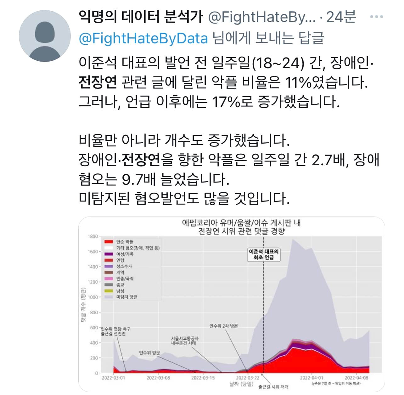 이것은 곧 의도한 효과를 불러일으켰다. 이준석의 SNS, 이준석이 공유한 유튜브, 청년극우플랫폼, 이준석의 주장을 실은 언론들에 곧 장애인을 벌레에 비유하면서 죽여버리고 싶다고 말하는 수많은 댓글들이(이미 있기도 했지만) 엄청나게 늘어나기 시작한 것이다.
