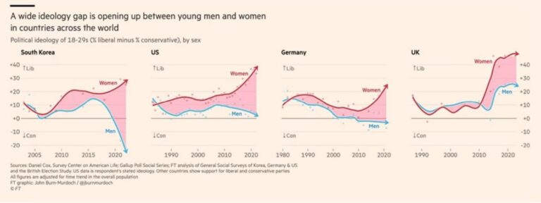 팔루디의 책을 통해 극우파의 부상은 (유일한 이유는 아니지만) 첫 번째로 무엇보다도 페미니즘의 제4의 물결에 대한 반작용이라는 것을 이해할 수 있었다. 장담하건대, 데이터는 반박할 수 없는 사실이다. 지난 1월 25일, 파이낸셜 타임즈는 많은 극우에 대한 분석가들의 머리를 폭발적으로 자극한 연구 결과를 발표했다. 이 기사는 한국, 미국, 독일, 영국에서 성별에 따른 청년의 투표율을 보여주었다.
