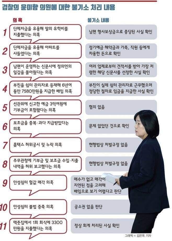 위의 이미지가 요즘 여기저기 많이 나돌고 공유되고 있다. 일단 너무나 반가운 일이다. 주류언론과 기득권 우파가 퍼트렸던 거짓을 반박하면서 마녀사냥 당한 피해자의 입장을 대변하는 목소리가 힘을 얻기 시작한 것이니 말이다. 이것을 보면 대부분의 의혹이 사실무근이었고 검찰마저도 기소할 근거를 찾지 못했다는 것을 알 수 있다.