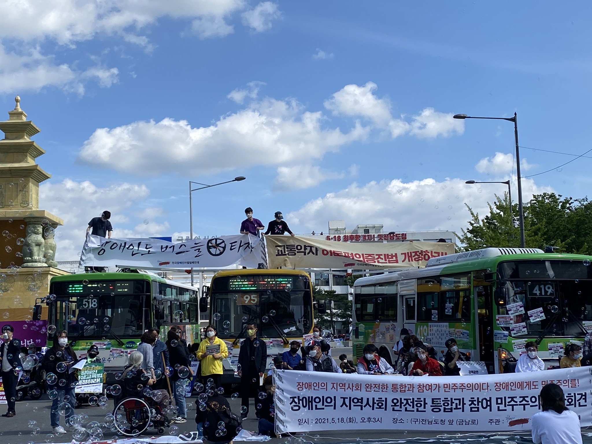 2021년 5월 18일 광주 구, 전남도청 앞에서 장애인은 또 이동권 투쟁을 시작했다. 우연의 일치(?)일지는 모르겠지만, 장애인은 타지도 못하는 차별버스 스타일의 419번, 518번 버스를 상대로 장애인은 지역 차별 없는 제대로 된 이동권 보장을 얘기하며 또 쇠사슬을 걸고 버스 위에 올라가 현수막을 들고 또 도로 위에서 피켓을 들고 소리쳤다. 40년 전 민주주의를 외쳤던 그 광장에서 장애인이 이제는 장애인의 민주주의를 외치며 투쟁했던 것이다.