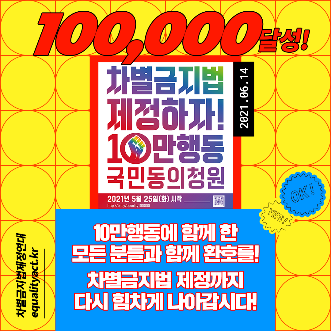 얼마전 국가보안법 폐지 청원에 이어서 얼마전 차별금지법 국민청원도 10만을 조기 달성하며 성공적으로 마무리됐다. 특히 막판의 급속한 증가 속도는 너무 반갑고 가슴벅찬 일이었다. 한국사회에는 무엇이 더 중요하고 우선이라고 보기 힘든 수많은 과제들이 있는데, 근래 개인적으로 가장 관심갖는 것은 국가보안법 폐지와 차별금지법 제정이다.