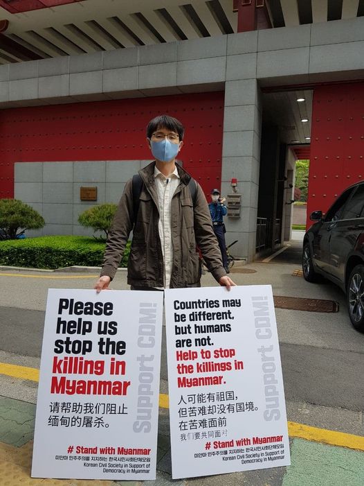 지난주에 ‘미얀마 민주주의를 지지하는 한국 시민사회단체 모임’은 미얀마 군부 테러 집단의 우두머리인 흘라잉의 아세안 정상회의 참석을 규탄하는 기자회견을 열고 각국 대사관에 항의서한을 전달했다. 여기엔 가지 못하고 그날 점심 시간에 중국대사관 릴레이 1인시위에 동참했다.